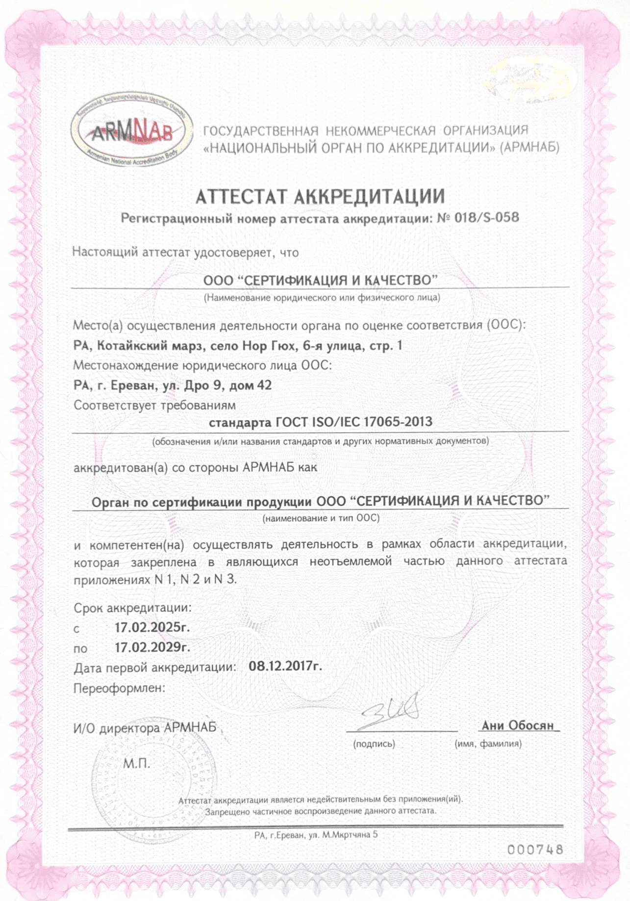 ООО «Сертификация и Качество» аккредитовано в соответствии со стандартом ГОСТ ИСО/МЭК 17065-2013 - Сертификат Соответствия N 018/Т-058 (http://www.armnab.am/CertificationBodyListRU) и назначено министерством Экономики РА - как орган по оценке соответствия - Свидетельство о Подтверждении Сертификата Н-21 (https://mineconomy.am/page/400).